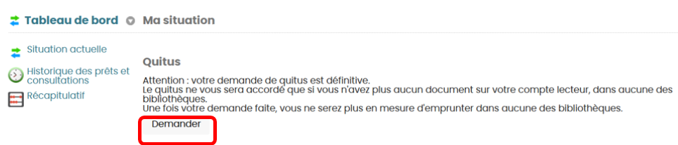 Attention ! La délivrance du quitus entraîne la clôture de votre compte lecteur. Tout emprunt sera impossible.